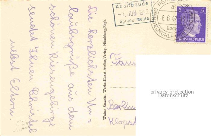 74032962 old postcard Spindlermuehle Spindleruv Mlyn CZ Am Spindlerpass Sudetengau Riesengebirge postalisch gelaufen Erhaltung siehe scans [FriedD77] KatCode: 11520