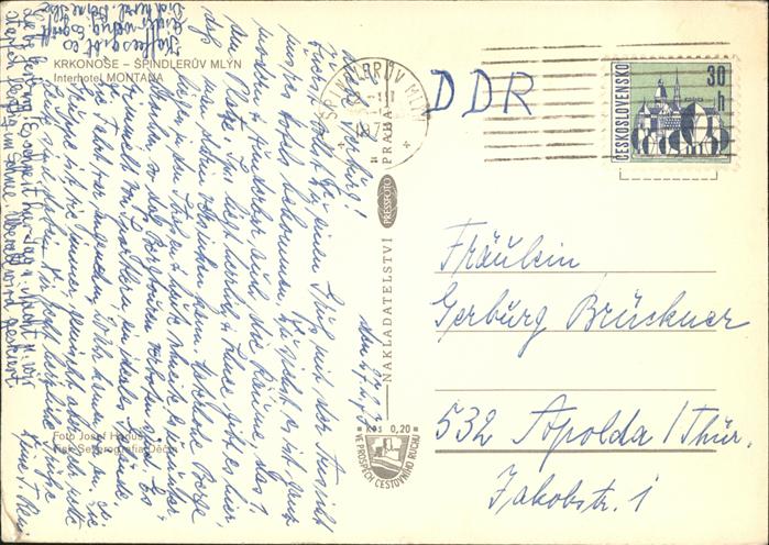 old postcard Spindlermuehle Spindleruv Mlyn Krkonose Interhotel Motana postalisch gelaufen Erhaltung siehe scans