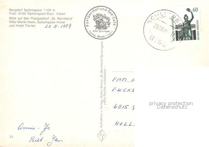 72942879 alte Postkarte Spitzingsee Bergdorf Bayerische Alpen Postgasthof St Bernhard Willy Merkl Heim Hotel postalisch gelaufen Erhaltung siehe scans [FriedD77] KatCode: 11110009182131