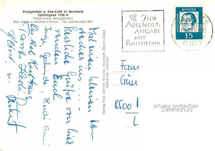 72764501 alte Postkarte Spitzingsee Postgasthof Sankt Bernhard postalisch gelaufen Erhaltung siehe scans [AndreD76] KatCode: 11110009182131