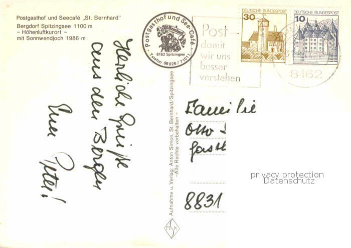 72724047 alte Postkarte Spitzingsee Postgasthof SeeCafe St. Bernhard mit Sonnwendjoch postalisch gelaufen Erhaltung siehe scans [LiesaD40] KatCode: 11110009182131