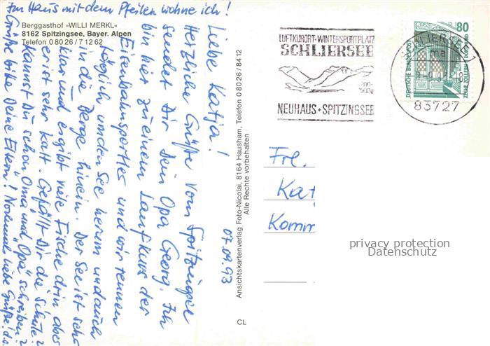 74043923 alte Postkarte Spitzingsee Schliersee Bayern Berggasthof Willi Merkl Gastraum Zimmer Seepartie postalisch gelaufen Erhaltung siehe scans [WerneD78] KatCode: 11110009182131