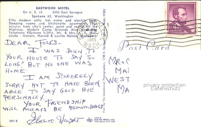 72316455 old postcard Spokane Washington Eastwood Motel postalisch gelaufen Erhaltung siehe scans KatCode: 14140500000000