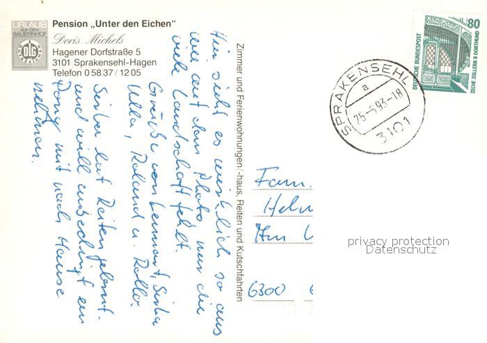 73641922 alte Postkarte Sprakensehl Pension Unter den Eichen Pferdewagen Reiter Viehweide Kinderspielplatz postalisch gelaufen Erhaltung siehe scans [WerneD78] KatCode: 11110003151028