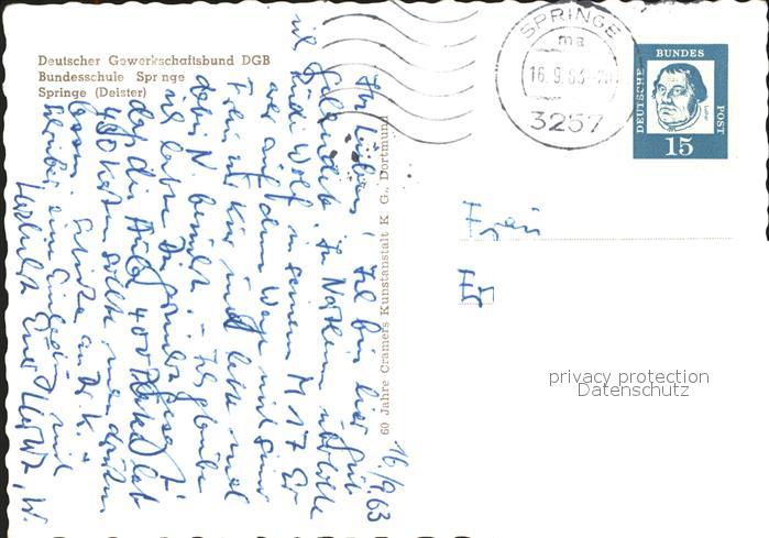 71991763 alte Postkarte Springe Deister Bundesschule Deutscher Gewerkschaftsbund DGB postalisch gelaufen Erhaltung siehe scans KatCode: 11110003241017