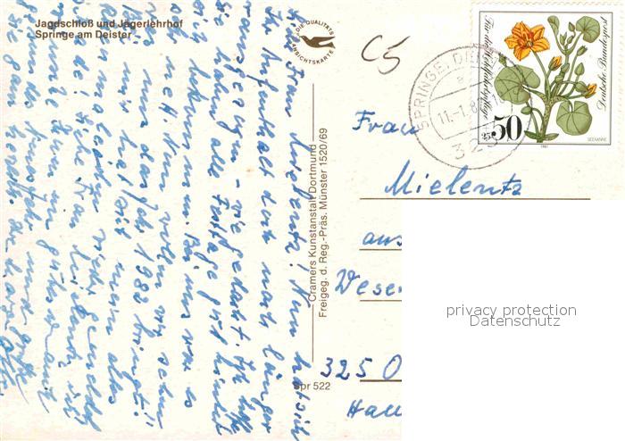 72741880 alte Postkarte Springe Deister Jagdschloss und Jaegerlehrhof Fliegeraufnahme postalisch gelaufen Erhaltung siehe scans [WerneD78] KatCode: 11110003241017