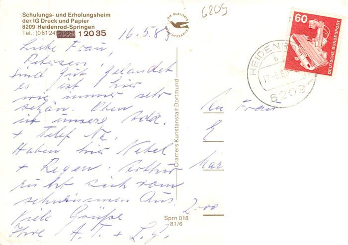 73936557 alte Postkarte Springen Heidenrod Taunus Schulungs und Erholungsheim Springen der IG Druck und Papier Schaenke Hoersaal Bibliothek Foyer Schwimmbad postalisch gelaufen Erhaltung siehe scans [FriedD77] KatCode: 11110006439005