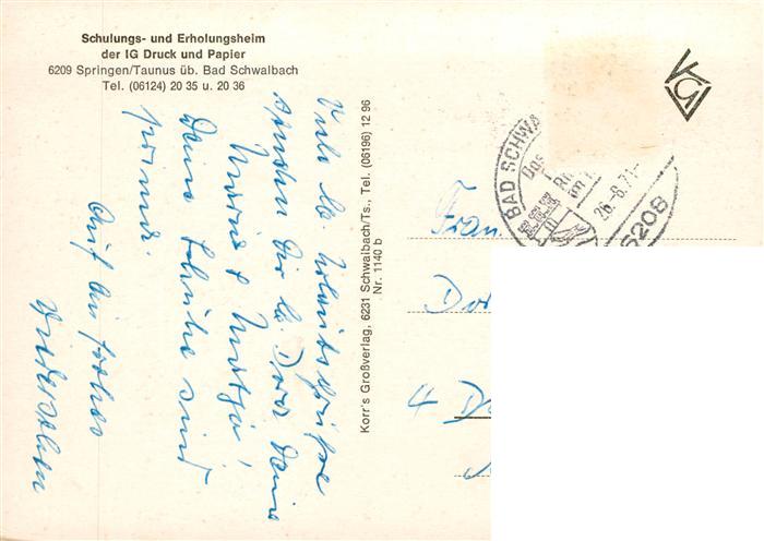 73936568 alte Postkarte Springen Heidenrod Taunus Schulungs und Erholungsheim Springen der IG Druck und Papier Eingangshalle Liegewiese postalisch gelaufen Erhaltung siehe scans [FriedD77] KatCode: 11110006439005