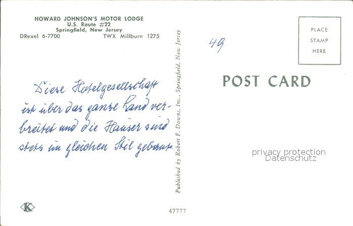 72278206 Springfield New Jersey Howard Johnsons Motor Lodge Motel postalisch nicht gelaufen Erhaltung siehe scans KatCode: 14140320000000