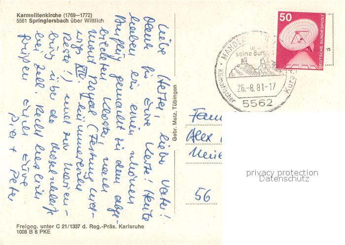 73717692 alte Postkarte Springiersbach Karmelitenkirche Fliegeraufnahme postalisch gelaufen Erhaltung siehe scans [WerneD78] KatCode: 11110007231005