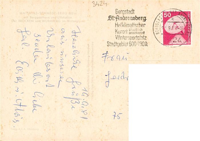 73948433 alte Postkarte St Andreasberg Harz Berggasthaus und Lift mit Brocken und Wurmberg postalisch gelaufen Fliegeraufnahme Erhaltung siehe scans [WerneD78] KatCode: 11110003153010