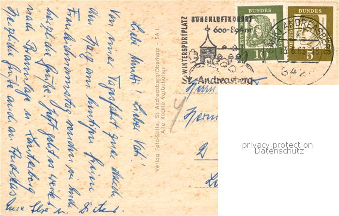 73334183 alte Postkarte St Andreasberg Harz Glockenturm Blick von Drei Jungfern Auf der Hoehe Glockenberg Brunnen Schuetzenstrasse Herrenstrasse postalisch gelaufen Erhaltung siehe scans [WerneD78] KatCode: 11110003153010