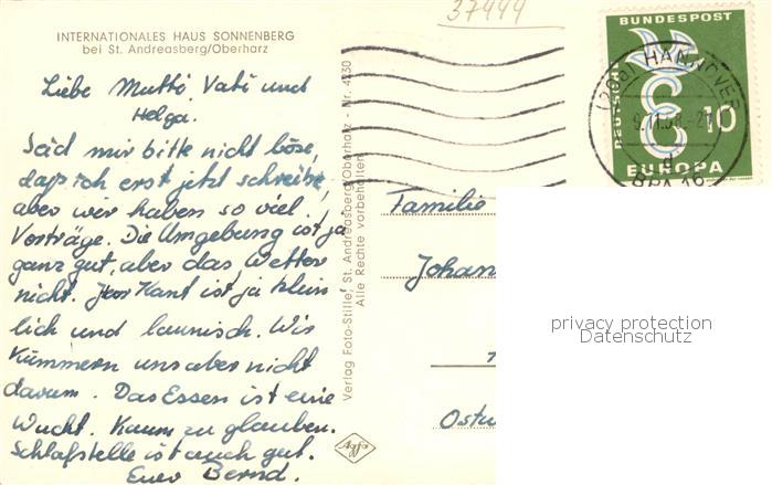 73762631 alte Postkarte St Andreasberg Harz Internationales Haus Sonnenberg postalisch gelaufen Erhaltung siehe scans [FriedD77] KatCode: 11110003153010