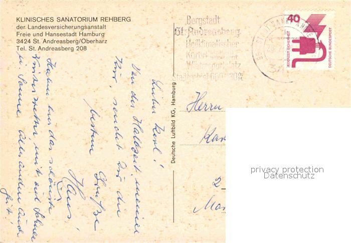 72833674 alte Postkarte St Andreasberg Harz Klinisches Sanatorium Rehberg Fliegeraufnahme postalisch gelaufen Erhaltung siehe scans [FriedD77] KatCode: 11110003153010