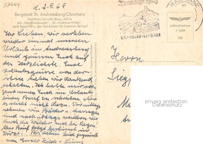 73668567 alte Postkarte St Andreasberg Harz Matthias Schmidt Berg mit Matthiasbaude St Andreas Huette und Sandpiste fuer Sommer Skilauf Fliegeraufnahme postalisch gelaufen Erhaltung siehe scans [WerneD78] KatCode: 11110003153010