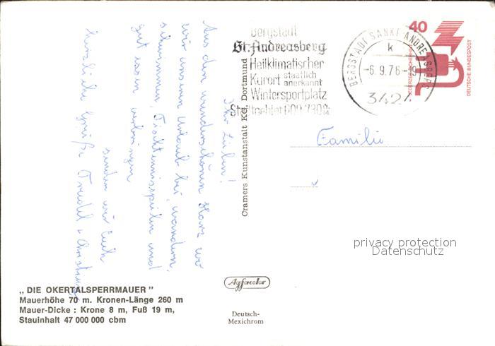 72412078 alte Postkarte St Andreasberg Harz Okertalsperrmauer postalisch gelaufen Erhaltung siehe scans KatCode: 11110003153010