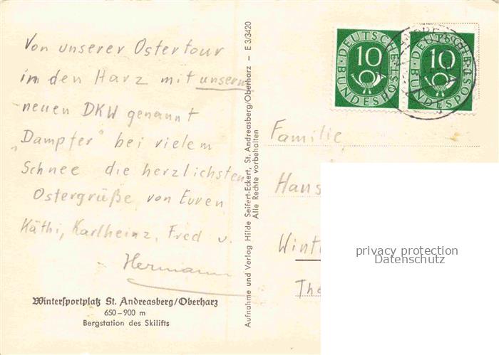 74092011 alte Postkarte St Andreasberg Harz Wintersportplatz Bergstation des Skilifts postalisch gelaufen Erhaltung siehe scans [FriedD77] KatCode: 11110003153010