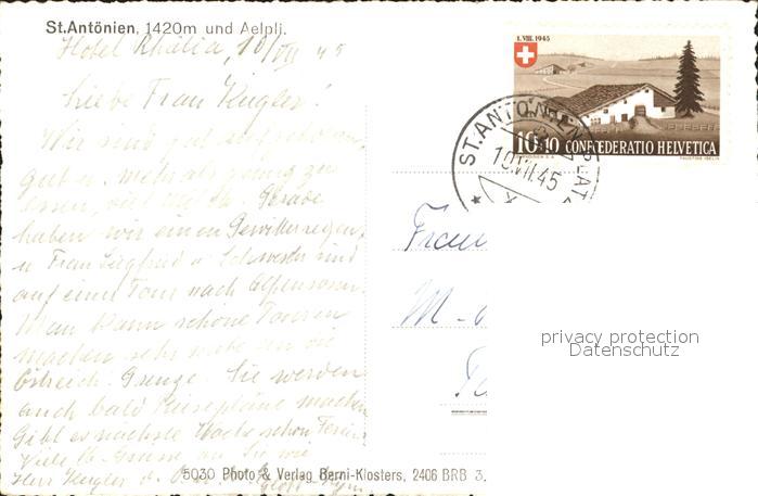 12029930 alte Postkarte St Antoenien GR Dorfansicht mit Kirche und Aelpli Bergwiese postalisch gelaufen KatCode: 11470100350410