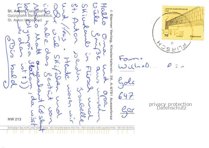 74010876 alte Postkarte St Anton Arlberg Tirol AT Galzigbahn Berggasthaus Hallenbad Sessellift postalisch gelaufen Erhaltung siehe scans [WerneD78] KatCode: 11390334070621