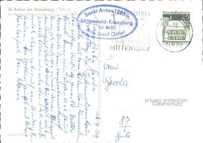 72050389 alte Postkarte St Anton Kranzberg Panorama gegen Karwendelgebirge Bergwiese postalisch gelaufen KatCode: 11110009180117