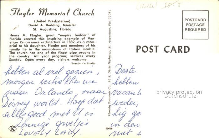 71964867 St Augustine Flagler Memorial Church postalisch nicht gelaufen Erhaltung siehe scans KatCode: 14140110000000