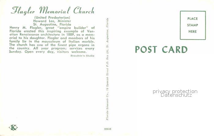 72744090 St Augustine Flagler Memorial Church postalisch nicht gelaufen Erhaltung siehe scans [LiesaD40] KatCode: 14140110000000