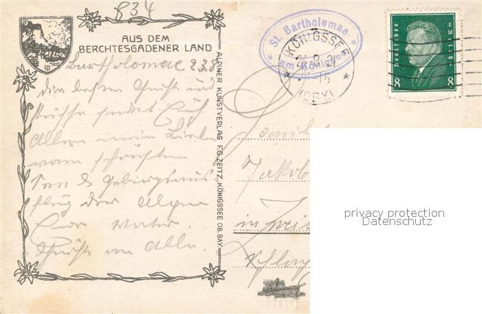 73576151 alte Postkarte St Bartholomae Seebad am Koenigssee Berchtesgadener Alpen postalisch gelaufen Erhaltung siehe scans [FriedD77] KatCode: 11110009172132