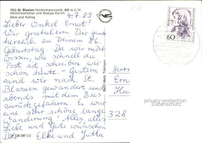 72606698 alte Postkarte St Blasien Dom Kolleg postalisch gelaufen Erhaltung siehe scans [NatalD47] KatCode: 11110008337097