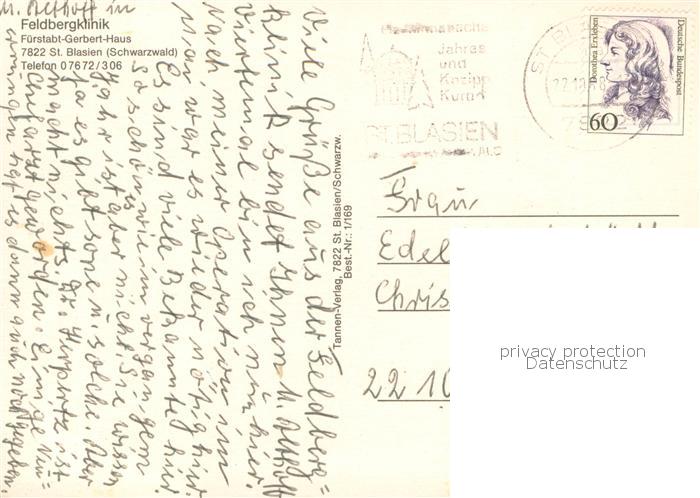 73782812 alte Postkarte St Blasien Feldbergklinik postalisch gelaufen Erhaltung siehe scans [WerneD78] KatCode: 11110008337097