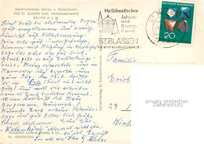 72959901 alte Postkarte St Blasien Fliegeraufnahme postalisch gelaufen Erhaltung siehe scans [WerneD78] KatCode: 11110008337097