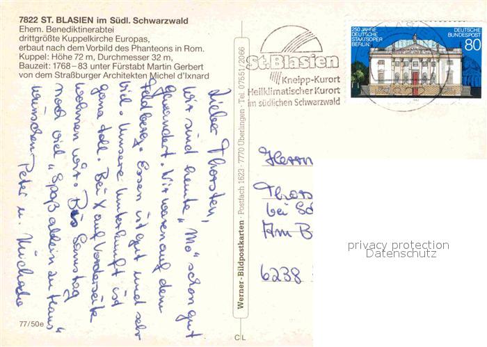72636233 alte Postkarte St Blasien Fliegeraufnahme Ehem Benediktinerabtei postalisch gelaufen Erhaltung siehe scans [WerneD78] KatCode: 11110008337097