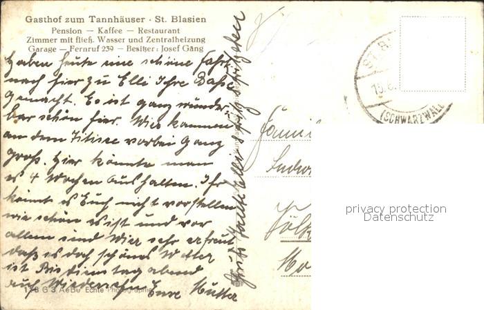 41994297 alte Postkarte St Blasien Gasthof Zum Tannhaeuser postalisch gelaufen Erhaltung siehe scans KatCode: 11110008337097
