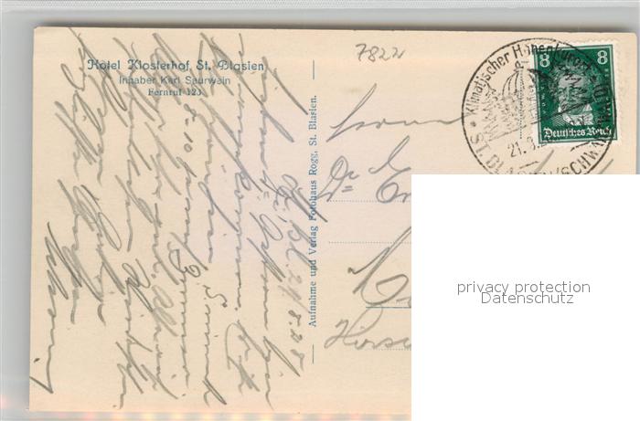 42943459 alte Postkarte St Blasien Hotel Klosterhof postalisch gelaufen Erhaltung siehe scans [AndreD76] KatCode: 11110008337097