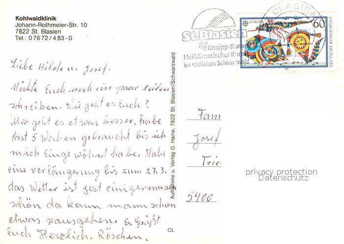 72886520 alte Postkarte St Blasien Kohlwaldklinik Kurort im Schwarzwald postalisch gelaufen Erhaltung siehe scans [FriedD77] KatCode: 11110008337097