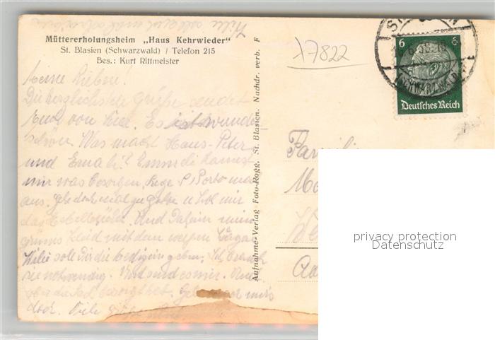 42943457 alte Postkarte St Blasien Muettererholungsheim Haus Kehrwieder postalisch gelaufen Erhaltung siehe scans [AndreD76] KatCode: 11110008337097