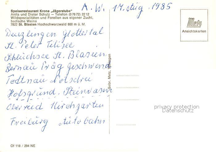 73321189 St Blasien Restaurant Krone Jaegerstube Forellenteich Stadtpanorama Schwarzwald postalisch nicht gelaufen Erhaltung siehe scans [FriedD77] KatCode: 11110008337097