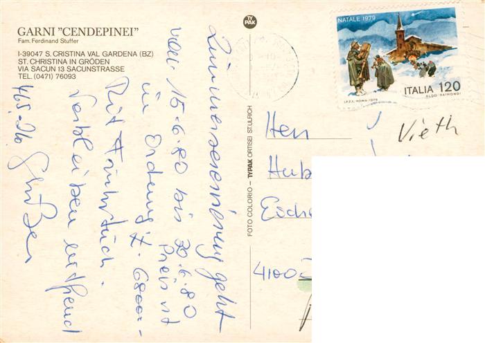 73905707 old postcard St Christina Groeden IT Garni Cendepinei postalisch gelaufen Erhaltung siehe scans [WerneD78] KatCode: 11240