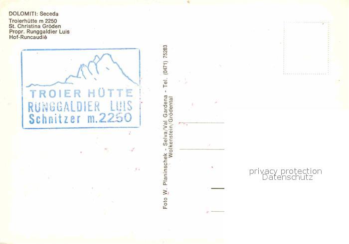 St Christina Troierhuette Dolomiten postalisch nicht gelaufen Erhaltung siehe scans [FriedD77]