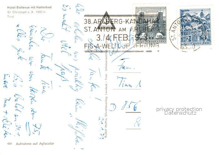 12909752 alte Postkarte St Christoph Arlberg Hotel Bellevue postalisch gelaufen Erhaltung siehe scans [AndreD76] KatCode: 11390334070621