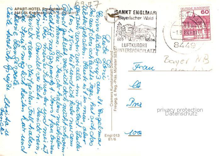 72930769 alte Postkarte St Englmar Apart-Hotel Predigtstuhl postalisch gelaufen Erhaltung siehe scans [LiesaD40] KatCode: 11110009278184