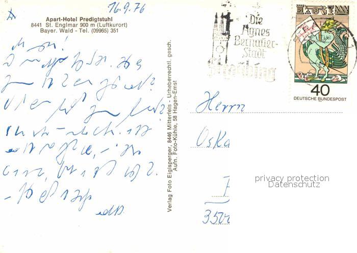 72905789 alte Postkarte St Englmar Aparthotel Predigtstuhl Roemerlagune postalisch gelaufen Erhaltung siehe scans [FriedD77] KatCode: 11110009278184