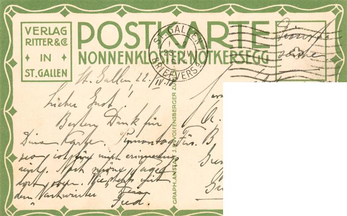 13908515 alte Postkarte St Gallen SG Nonnenkloster Notkersegg Steinzeichnung postalisch gelaufen Erhaltung siehe scans [FriedD77] KatCode: 11470190580766