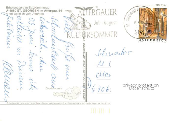 73364327 alte Postkarte St Georgen Attergau Erholungsort Attersee Alpenpanorama Fliegeraufnahme postalisch gelaufen Erhaltung siehe scans [FriedD77] KatCode: 11390315041746