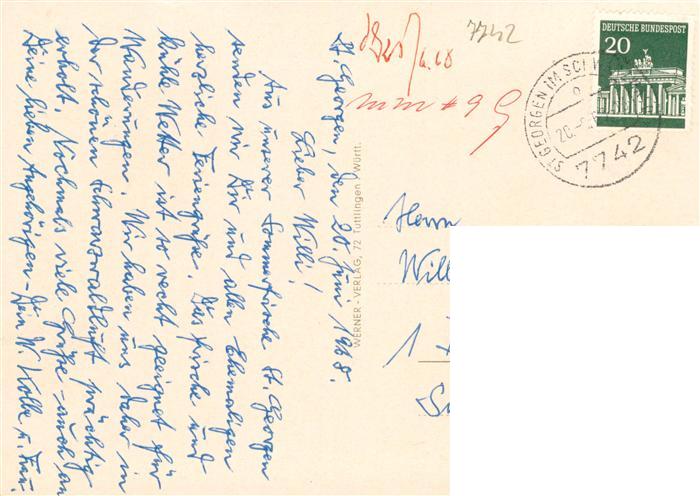73938242 St Georgen Schwarzwald Nussbachtal Park Schwimmbad Brunnen Panorama Trachtengruppe ev und kath Kirchen postalisch gelaufen Erhaltung siehe scans [WerneD78] alte Postkarte Wern Katcode 11110008326052