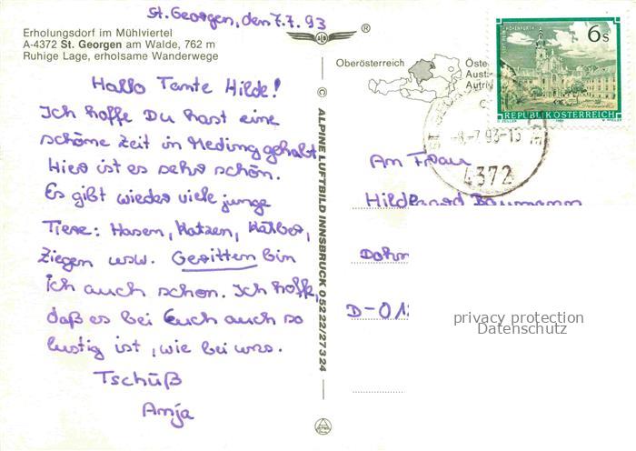 74025829 alte Postkarte St Georgen Walde Panorama Erholungsdorf im Muehlviertel postalisch gelaufen Fliegeraufnahme Erhaltung siehe scans [FriedD77] KatCode: 11390313041116