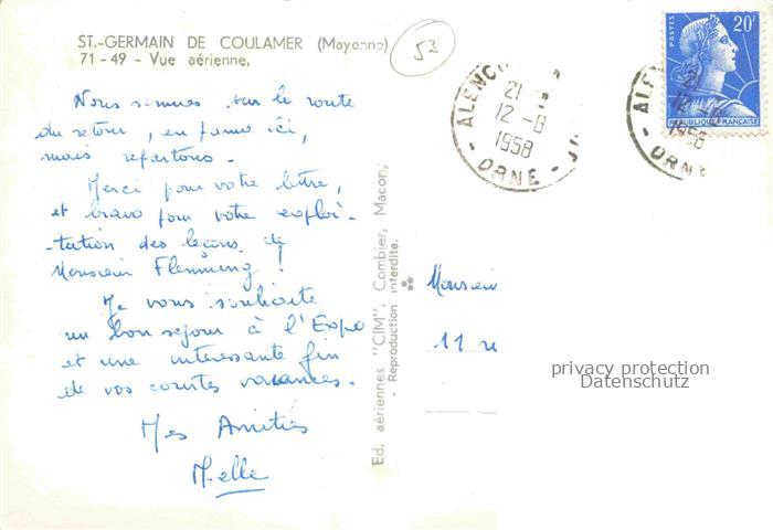34146233 carte postale St-Germain-de-Coulamer 53 Mayenne Vue générale aérienne postalisch gelaufen Fliegeraufnahme Erhaltung siehe scans [FriedD77] KatCode: 11170053353223