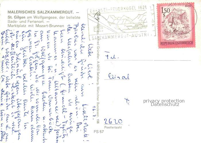 74138875 alte Postkarte St Gilgen Wolfgangsee AT Marktplatz mit Mozart Brunnen postalisch gelaufen Erhaltung siehe scans [WerneD78] KatCode: 11390