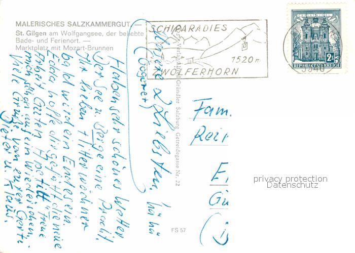 72899374 alte Postkarte St Gilgen Wolfgangsee Marktplatz mit Mozartbrunnen postalisch gelaufen Erhaltung siehe scans [AndreD76] KatCode: 11390