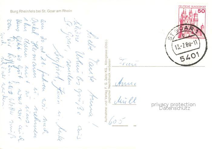 73260063 alte Postkarte St Goar Burg Rheinfels postalisch gelaufen Erhaltung siehe scans [NatalD47] KatCode: 11110007140133