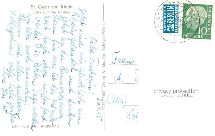 73810761 St Goar Rhein Blick auf die Loreley postalisch gelaufen Erhaltung siehe scans [WerneD78] alte Postkarte Wern Katcode 11110007140133